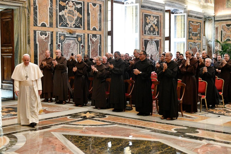 Me complace daros la bienvenida, aquí reunidos para el Capítulo General, procedentes de diferentes regiones del mundo, como representantes de los aproximadamente cuatro mil frailes que forman parte de vuestra Orden. Mi saludo se extiende también a ellos, así como a las monjas carmelitas descalzas y a todos los miembros de la familia carmelita, que en estos días siguen con la oración vuestros trabajos. Doy las gracias al nuevo Prior General por sus palabras, y al Prior General saliente por su servicio. Gracias.